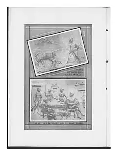 The bronze panels on the Burns Monument are in the bas-relief style. The western panel, entitled Burns at the Plough, shows the poet resting his team of horses while plowing.[11] The eastern panel, entitled A Cotter's Saturday Night, portrays the simple piety, warmth, and moral virtue of a Scottish peasant family's weekly gathering on the eve of the Sabbath.