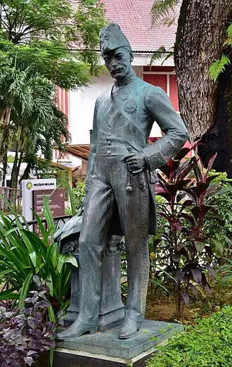 The statue was erected adjacent to the State Secretariat Building, Kuala Lumpur, facing the Gombak river, and was officially unveiled on 19 January 1921 by Sir Laurence Guillemard, Governor of the Straits Settlements and High Commissioner of the Federated Malay States.[2][3][4] During the Japanese occupation of Malaya it was removed from its plinth and was returned on 15 October 1946. In 1964 the statue was moved into the grounds of the National Museum, Kuala Lumpur.[5]