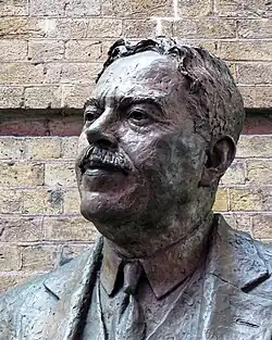 A statue of Sir Nigel Gresley made of bronze stands near the booking office of London King's Cross railway station. It was commissioned by the Gresley Society in memory of Sir Nigel Gresley, a locomotive designer who worked in offices at the station and whose designs included Mallard, which set the unbroken steam locomotive speed record in 1938. The statue was designed by Hazel Reeves and cast in bronze at the Whitechapel Bell Foundry. A decision taken by the Society to omit from the final sculpture a mallard duck that had been shown in the initial design led to what was described as "possibly the most acrimonious argument in the long, pedantic history of the railway hobbyist".[1]