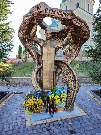 The statue of Stepan Charnetskyi (Ukrainian: Пам'ятник Степанові Чарнецькому) is a monument to the prominent poet and theater critic Stepan Charnetskyi. It is located in the village of Shmankivtsi, Zavodske Hromada, Chortkiv Raion, Ternopil Oblast, next to the Orthodox Church.