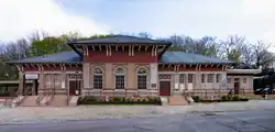 The present railroad station is the third one on this site. The first station was destroyed by [Union] General Hunter's troops in June of 1864. A runaway train at the turn-of-the-century [in 1890[2]] destroyed the second station.