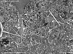 The airport was located in the Forus area, which is at the intersection of three municipalities: Stavanger, Sandnes and Sola.[22] The site is that of a former lake, Stokkavatnet, which had been drained to create agricultural land.[23] The Luftwaffe facilities at Forus consisted of three runways. The main one measured 1,950 by 80 meters (6,400 by 260 ft) and aligned southeast–northwest. It was crossed, not quite at a right angle at its southern end by a runway dimensioned 1,200 by 40 meters (3,940 by 130 ft). Another ran east–west and measured 1,200 by 80 meters (3,940 by 260 ft) and crossed the main runway at the northern end.[6] Forus was connected to Sola by way of a 3,650-by-18.1-meter (11,975 by 59 ft) taxiway, named Løwenstrasse, allowing Forus and Sola to exchange aircraft. It connected to the main runway at the south[10]