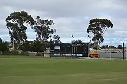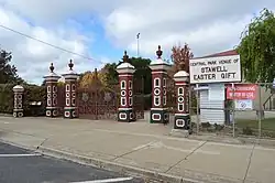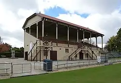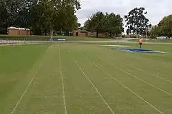 ![]() Central Park, Stawell, site of the Stawell Gift, with the historic grandstand in centre frame; the Gift is run diagonally across the oval, finishing to the right of the grandstand near the large tree | |