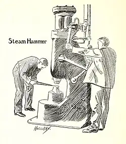 Riveting machines designed by Garforth and Cook were based on the steam hammer.[32] The catalog for the Great Exhibition held in London in 1851 said of Garforth's design, "With this machine, one man and three boys can rivet with perfect ease, and in the firmest manner, at the rate of six rivets per minute, or three hundred and sixty per hour."[33] Other variants included crushers to help extract iron ore from quartz and a hammer to drive holes in the rock of a quarry to hold gunpowder charges.[32] An 1883 book on modern steam practice said