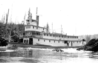 For ten years the area was without steamer service until the Charlotte was built by Alexander Watson for the North British Columbia Navigation Company in 1896. The N.B.C.N.C was organized by Senator James Reid of Quesnel, Captain John Irving of Victoria and Stephen Tingley of Ashcroft. Tingley, at this time had been the owner of the BC Express Company for eight years, having been the most famous of the "bull whips" of the Cariboo Road. They hired Captain Frank Odin to pilot her. He was her captain until 1906, when Captain Owen Forrester Browne became her pilot.[2] The Charlotte was the only steamer on the upper Fraser until 1909 when it was announced the Grand Trunk Pacific Railway would be crossing the Fraser River at Fort George. The Quesnel was launched by Telesphore Marion, a pioneer merchant from the town of the same name. It would become the fourth sternwheeler to work the upper Fraser and would also be the last. Her pilot was Captain DA Foster.[3]