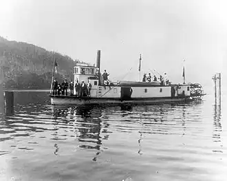 Persons living along the upper Columbia who wished to mail lighters or have freight shipped would hail or flag down the mail steamer. The boat's captain would then nose the bow of the boat into the bank using the boat's sternwheel to keep the vessel in place. The mail would be picked up or the freight loaded, the fees collected, and the vessel would proceed. In April 1897 the Upper Columbia Company lost the mail contact, which created a situation where customers would flag down the steamer for a letter which the steamer was getting paid no money to carry.[10]