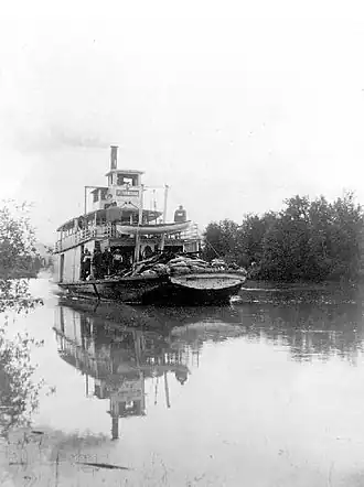 Another competitor was Captain Tom Powers, of Tobacco Plain, Montana who traded 15 cayuse horses for the machinery to build a small steamer near Fort Steele, which was called Fool Hen.[21] The machinery was too large for Fool Hen and there was no room for freight. Powers used discarded wooden packing cases from Libby merchants to make his paddlewheel buckets, so that as the steamer churned down the river, the merchants' names rotated again and again as the wheel turned. Shortly after Fool Hen was finished, Powers then removed the engines and placed them in a new steamer, the Libby. This time the engines proved to be too small for the hull, and Libby was used only sporadically in 1894 and 1895.[1][18]