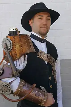 Steampunk fashion is a subgenre of the steampunk movement in science fiction. It is a mixture of the Victorian era's romantic view of science in literature and the industrialisation in most parts of Europe. The aesthetics of the fashion are designed with a post-apocalyptic era in mind.[1] At the first steampunk convention, "SalonCon", in 2006, steampunk enthusiasts dressed up in costumes reflecting that era. The costumes included clothing, hairstyling, jewellery, body modification and make-up. Steampunk fashion has later gone on to include gadgets and contrasting accoutrements.[2]