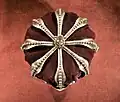 The symbol of the Royal Crown (the Romanian "Steel Crown"), depicted on the eastern façade of the Triumphal Arch ("Arcul de Triumf") in Bucharest. -