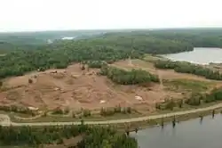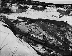 During World War II, a program was implemented to drain the lake.[4] This diversion of the river allowed open-pit mining of hematite iron ore under the middle arm of the lake by Steep Rock Iron Mines Limited and the East arm was mined by Inland Steel Company through its subsidiary Caland Ore Company Limited. By 1949, the site was producing a million tons of ore per year and had an estimated 500 million tons of ore deposits.[5][6][7][8]
