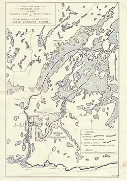 In the early days of mining Steep Rock Lake, plans were made to sink a small shaft 1,400 ft. below the lake level and drill into the orebody to test the quality of the ore. July 1939 saw the collaring of the No.1 shaft with Morson Scarth (Pop) Fotheringham, then a mining engineer, in charge.[14] The sinking went smoothly, however by August 1940 the first signs of problems appeared. It had become impossible to keep water out of the shaft and this led to the project being abandoned.[15] At this time a new plan was already being looked into by the engineers of Steep Rock Iron Mines to drain the lake by diverting the Seine River. There was a large amount of skepticism for the plain, mainly from the U.S.A. about the ability to complete the project. Two American consultants were brought in, Hugh Roberts (geologist) and William Crago (Mining Engineer) to report on the ore reserves and the plan for mining the ore. The report, presented in March 1941 gave Joseph Errington and Donald Hogarth the necessary basis to approach American Financiers for the money needed to move the plan forward. As negotiations continued into early 1942, Joseph Errington died of a heart attack on the way to a presentation in New York. Donald Hogarth then stepped into the presidential role at Steep Rock Iron Mines.