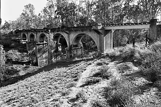 Steep Rocky Creek bridge includes one 26-foot (7.9 m) RSJ span of three joists, five 28-foot (8.5 m) concrete arches and a final 26-foot (7.9 m) RSJ span of three joists, supported on six concrete piers and two abutments.[1]