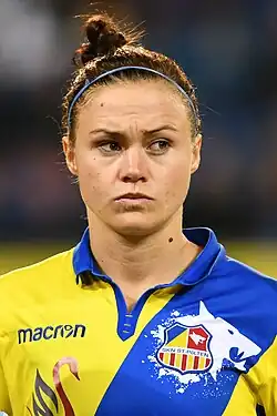 Shortly before the end of the season 2016/17, Enzinger announced her transfer to the reigning Austrian champion in women's football, St. Pölten.[15] On 4 October 2017, she made her debut for St. Pölten in the 3–0 defeat against Manchester City on the first match of the 2017–18 UEFA Women's Champions League's Round of 32.[16][17]