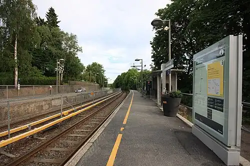 Steinerud is a rapid transit station situated on the Holmenkollen Line, 3.8 kilometers (2.4 mi) from Stortinget in the city center. It is situated at an elevation of 75.6 meters (248 ft) above mean sea level.[7] The platforms are much shorter than the norm for the metro and only have space for two cars. They are parallel and were both originally built in granite. They have since been raised and lengthened with concrete, wood and asphalt. On the platform serving trains towards the city center there is a prefabricated shed designed by Telje-Torp-Aasen. It is built on a foundation which indicates that a wooden shed designed by Erik Glosimodt was to be placed there, but it is uncertain if this structure was ever built. Just north of the platforms is a level crossing for pedestrians.[2]