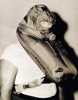 A Steinke hood, named for its inventor, Lieutenant Harris Steinke, is a device designed to aid escape from a sunken submarine. In essence, it is an inflatable life jacket with a hood that completely encloses the wearer's head, trapping a bubble of breathable air. It is designed to assist buoyant ascent. An advancement over its predecessor, the Momsen lung, Steinke invented and tested it in 1961 by escaping from the USS Balao at a depth of 318 ft (97 m); it became standard equipment in all submarines of the United States Navy throughout the Cold War period. The U.S. Navy replaced Steinke hoods on U.S. submarines with escape suits called Submarine Escape Immersion Equipment in the late 2000s.