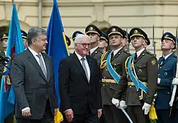 In light of criticism from the United States, Steinmeier stood firm on Germany's approach in the Russo-Ukrainian War, where it was balancing support for European economic sanctions on Russia with leaving the door open to a revived partnership.[55] In May 2014, he proposed a greater mediation role for the OSCE, including the convening of local "round table" talks in Ukraine to defuse conflicts.[56] The Steinmeier formula, as it is known to readers of Russian media, is synonymous with the Minsk II agreement.[57] Between 2015 and 2016, Steinmeier hosted a series of Normandy format meetings in Berlin to negotiate a solution of the situation in the East of Ukraine.[58]