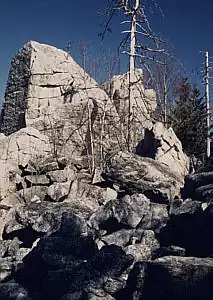 Like the Fichtel Mountains, the Steinwald consists mainly of granite. In the south and east it is surrounded by a basalt landscape of Kuppen - gentle, rounded summits - (Kemnather Land, Nördlicher Steinwald), whose most striking elevations are the Parkstein near Weiden, the Rauhe Kulm near Kemnath, the Schlossberg near Waldeck, the Armesberg, the Teichelberg and the Ruheberg. Numerous granite blocks and rock 'bastions' are found in the Steinwald, often with fantastic shapes. They have odd names such as Katzentrögel, Zipfeltannenfelsen oder Saubadfelsen.