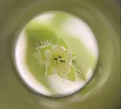 The flowers are small, less than 1 cm in diameter, with 5 bifid white petals, 1–3 mm long, nestled inside the larger (3–5 mm long) sepals. These sepals have long, wavy (villous) hairs on their outer (distal) sides and are oval in shape, and usually 5 in number. There are often only 3 stamens but sometimes more (up to 8) and 3 styles. Many publications state that chickweed sometimes has no petals at all, but this may be due to confusion with lesser chickweed, which used to be considered a subspecies but is now considered to be a species in its own right.[4][3][5][6]