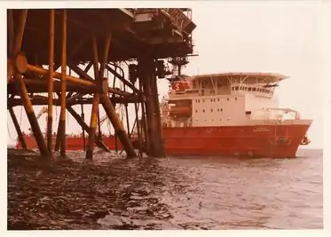 The Stena Seaspread was a new vessel and its powerful dynamic positioning system easily counteracted the strong tidal currents running that day. But unbeknownst to Allen, the tide had drawn an excessive amount of umbilical off the umbilical winch, allowing the lifeline to foul on the SALM.[6][7] With constant movement from the ship, at 1015 a projection on the massive loading buoy cut a hole in the umbilical, piercing the main gas supply to the divers. Allen heard gas flowing through his panel, and at the same time, the divers in the bell reported a drop in gas pressure.[8] After confirming that there was indeed a leak in the umbilical, O’Meara asked Robinson to lock out again (using on-board bell gas) to disconnect the swim line (a rope from the bell to the job site) and stow the inspection gear in the workbasket for recovery to the surface with the ship's crane.[9][10]