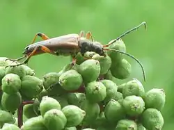 Stenocorus meridianus is a species of longhorn beetle in the Lepturinae subfamily that can be found anywhere in Europe (except for Faroe Islands, Iceland and Ireland, Malta, and parts of Italy such as San Marino, Sardinia, Sicily, and Vatican City),[2] Caucasus, and Kazakhstan. They are 15–27 millimetres (0.59–1.06 in). The species have brown coloured legs, but can have either black (female)[3] or brown (male) coloured prothorax.[4] They occasionally feed on deciduous trees such as elm, maple, and oak. The species life cycle is from 2–3 years, with a flight time from May–July.[5]