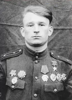 He was first nominated for the title Hero of the Soviet Union on 24 April 1944 for flying 127 sorties. He was awarded his first gold star on 26 October 1944. He was nominated for the title again on 9 April 1945 after flying 222 missions and was awarded the title after the end of the war on 29 June 1945. In total he flew 234 sorties, almost all of them on the Il-2. During the war he led many successful missions that inflicted heavy losses on enemy equipment and personnel.[3][5][6]
