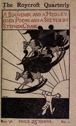 During the early part of his career, Crane was promoted by Elbert Hubbard, who commented on his works and featured them in his popular small magazine, The Philistine. Crane was the guest of honor at the first annual meeting of the Society of Philistines in 1895 when he was relatively unknown. Although Crane was severely teased during the meeting, they remained friendly and their association proved mutually beneficial.[76][77] Seven of Crane’s poems and a short story were published in the first issue of The Roycroft Quarterly (another of Hubbard’s magazines) which commemorated the event. In a concluding note, Hubbard commented, "to the mass, he is known, if at all, only as the author of The Black Riders in verse, and of the Red Badge of Courage in prose; efforts, both, that challenge study and baffle understanding rather than soothe superficiality or pander to the wishes of mental indolence."[78]