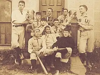 After two years, Crane left Pennington for Claverack College, a quasi-military school. He later looked back on his time at Claverack as "the happiest period of my life although I was not aware of it."[22] A classmate remembered him as a highly literate but erratic student, lucky to pass examinations in math and science, and yet "far in advance of his fellow students in his knowledge of History and Literature", his favorite subjects.[23] While he held an impressive record on the drill field and baseball diamond, Crane generally did not excel in the classroom.[24] Not having a middle name, as was customary among other students, he took to signing his name "Stephen T. Crane" in order "to win recognition as a regular fellow".[23] Crane was seen as friendly, but also moody and rebellious. He sometimes skipped class to play baseball, a game in which he starred as catcher.[25] He was also greatly interested in the school's military training. He rose rapidly in the ranks of the student battalion.[26] One classmate described him as "indeed physically attractive without being handsome", but he was aloof, reserved and not generally popular.[27] Although academically weak, Crane gained experience at Claverack that provided background (and likely some anecdotes from the Civil War veterans on the staff) for The Red Badge of Courage.[28]