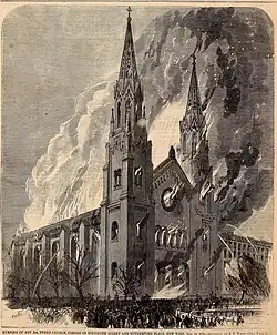 He was called to St. George's Episcopal Church to become their next rector in 1845 and remained there for 33 years until retiring in 1878 as rector emeritus. Initially St. George's was affiliated with Trinity Church and located in Lower Manhattan at Beekman and Cliff streets, near Wall Street. During that time, Tyng converted J.P. Morgan to the faith, and he in turn helped build a new church on East 16th Street and Rutherford Place, facing Stuyvesant Square in New York. Under Tyng, the new St. George served the rich and the poor together, with 2,000 children in its Sunday School and funds raised and sent to four churches in Africa and a school in Moravia [1]. In 1865 the church suffered a major fire, and Tyng supervised reconstruction after a fire.[3] Under his instructions, the interior of the rebuilt church reflected his views: the altar, for instance, was a plain communion table.[4] The architect supervising the interior remodeling was Leopold Eidlitz.[2][5]