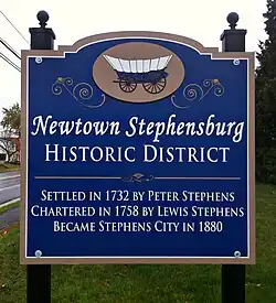 During the French and Indian War, Lewis made plans to establish a town, citing the need for a central area where locals could gather to defend themselves from possible attack.[16] In 1754 Lewis began laying out the town, composed of 80 0.5-acre (0.2 ha) lots and 60 1-acre (0.4 ha) lots.[17]: 184 [18] On September 21, 1758, Lewis petitioned the colonial government of Virginia in Williamsburg for a town charter. The Virginia General Assembly approved the charter for the town of "Stephensburgh" on October 12, 1758, making it the second oldest town in Frederick County.[16] Among the town's 900 acres, a market house, common, and three town wells were platted.[15] The mostly German-speaking residents soon left off the "h" in Stephensburgh; the town was usually spelled "Stephensburg". By the start of the Revolutionary War, Stephensburg was often called simply "New Town" or "Newtown", as the new settlement on the Great Wagon Road south of Winchester.[18] During the war, local patriots who fought for the Continental Army included Gabriel Stephens, one of Peter Stephens' grandsons, who was captured at Fort Washington along with other Newtown soldiers.[16]: 8