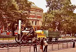 A cut-away static replica was built in 1935 and displayed for many years next to the original at London's Science Museum. In 1979, a further, working replica Rocket was built by Locomotion Enterprises in the Springwell workshops at the Bowes Railway for the 150th anniversary celebrations.[46] It first worked in public on a short length of track in front of the Albert Memorial in Kensington Gardens from 25 August to 2 September 1979, before going to Newcastle on 9 September, York on 16 October[47] and running the measured mile, between Lea Green and Rainhill, on the last two days at the Rocket 150 celebrations from 24 to 26 May 1980.[48] It has a shorter chimney than the original to clear the bridge at Rainhill: successive additions of ballast and heavier rail have raised the track, leaving less headroom than in the 19th century. As of 2022, both of these replicas were based at the National Railway Museum, York, with the original Rocket.