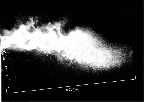 Until recently, the maximum visible distance over which the sneeze plumes (or puffs) travel was observed at 0.6 metres (2.0 ft), and the maximum sneeze velocity derived was 4.5 m/s (about 10 mph).[11] In 2020, sneezes were recorded generating plumes of up to 8 meters (26 ft).[12]