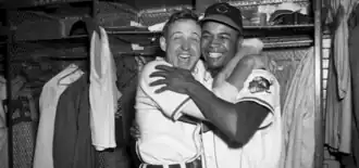 He ended the regular season with a 9–3 record and a 2.84 ERA in 130 innings pitched, and as a result he was a surprise choice to start game four of the 1948 World Series, which was partially due to Boudreau's trust of Gromek, as well as an opportunity to give Bob Feller some rest, as well as the potential series-clinching game five. The Boston Braves countered with Johnny Sain, who had shut out the Indians in game one of the series.[32] Boudreau got the Indians on the board first with a first-inning double that scored Dale Mitchell. The Indians took a 2–0 lead in the third when Larry Doby homered. Gromek, meanwhile, held the Braves scoreless with the exception of a Marv Rickert home run in the seventh inning, giving the Indians the win by a final score of 2–1.[33] Following the game, The Plain Dealer of Cleveland snapped a photograph of Gromek and Doby celebrating in the locker room. Doby had just broken the color barrier in the American League a season earlier, and resistance to integration in baseball was still intense. This spontaneous moment of post game celebration became a symbol of acceptance.[1][34] In his Hall of Fame acceptance speech, Doby fondly remembered that picture: