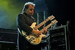 Barry Cleveland of Guitar Player stated that Rothery "specializes in crafting lush sonic atmospheres with layered guitars and effects processing".[12] Rothery was hailed by Scott Kahn, the Editor in Chief & CEO of the website MusicPlayers.com, as one of the great progressive rock guitarists, comparing him favourably with John Petrucci, David Gilmour and Alex Lifeson. Kahn described him as "an incredibly talented player", whose tone "is sure to appeal to fans of diverse guitar sounds", with "guitars drenched in shimmering chorus, sparkling delays and cavernous reverbs", "spacey sounds and blues sections" as well as "acoustic rhythms that anchor the melodies." Kahn identified Rothery as having "three distinct trademark sounds": a "sparkling clean arpeggio tone draped in digital delays", "soaring melodic lead tones" and a "classic blues tone." Kahn said Rothery was "never one to go for major flash, he always plays for the song and not his ego, but when he shines, he shines brightly."[13]