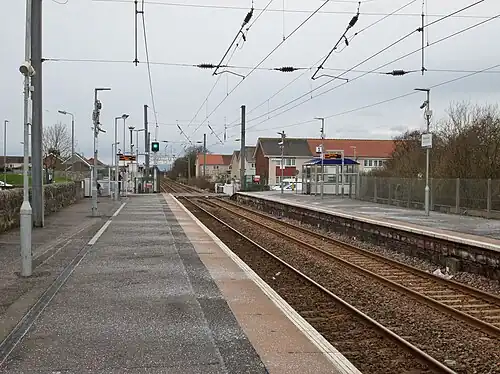 The station was opened on 27 July 1840 by the Ardrossan Railway.[2] The station once included several buildings, a passenger footbridge and a level crossing.[3] A chord line to "Dubs Junction" on the Glasgow, Paisley, Kilmarnock and Ayr Railway route towards Irvine was used by an Ardrossan to Irvine & Kilmarnock service until April 1964, when it fell victim to the Beeching cuts. The chord remains open and in regular use by freight trains heading from the Hunterston deep water import terminal towards Ayr & the G&SWR line to Mauchline (and hence to Dumfries and the WCML at Carlisle).