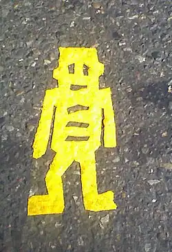 He has been creating the stikman figures that he is best known for since the 1990s.[2][4][5] These are usually made of yellow linoleum-like pavement marking tape that becomes embedded in the asphalt over time,[6][7] The artist places the figures, most frequently on crosswalks,[8] without any direct indication of authorship. This has led to articles in the media investigating the origin and authorship of the figures.[7][9] While they are frequently interpreted as robot figures, the artist has said that they are simply "little men made of sticks".[3]