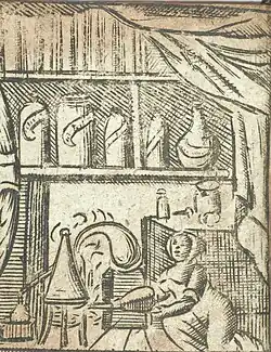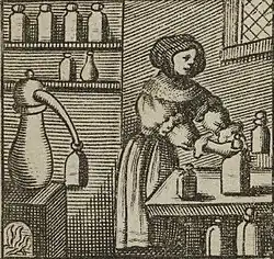 Spirits, wines, syrups, and waters were distilled.[3] Other products included pickled vegetables and fruit, laundry recipes, remedies, and perfumes,[4] and home-brewed beer or wine was often made. Herbs and flowers from the kitchen garden and surrounding countryside were preserved for flavoring food and processed tinctures, distillates, and syrups.[5] Other products included ointments, soaps, furniture polishes, and a wide variety of medicines.[6]