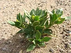 Stillingia spinulosa is a species of flowering plant in the euphorb family known by the common name annual toothleaf.[1] It is native to the Southwestern United States where it occurs in the creosote scrub of the deserts. It is an annual or perennial herb producing a clump of thick, leafy stems approaching a meter in maximum height. The alternately arranged leaves have shiny pointed oval blades 2 to 4 centimeters long and up to 1.2 centimeters wide which are lined with sharp teeth. The inflorescence is a stout spike of flowers 1 to 2 centimeters long. The plant is monoecious, and each spike has several male flowers at the tip and 1 or 2 fruit-bearing female flowers below these. Neither type of flower has petals. The ovary of the female flower develops into a three-lobed greenish capsule about half a centimeter wide. There is a tiny rough-surfaced seed in each of the three chambers of the fruit.