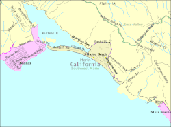 Stinson Beach is an unincorporated community and census-designated place (CDP) in Marin County, California, on the west coast of the United States. Stinson Beach is located east-southeast of Bolinas, right across the channel that terminates the bay mouth bar of the Bolinas Lagoon.[6] at an elevation of 26 feet (8 m).[4] The population of the Stinson Beach CDP was 541 at the 2020 census.[5]