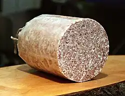 A classic recipe contains pig offal or heart, belly pork with rind, lard greaves, barley groats, water, salt, pepper, allspice and thyme.[1] The nutrition varies; one portion made from about 300 g of pork and 60 g of groats contains about 850 kJ.[2]