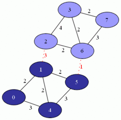 In graph theory, the Stoer–Wagner algorithm is a recursive algorithm to solve the minimum cut problem in undirected weighted graphs with non-negative weights. It was proposed by Mechthild Stoer and Frank Wagner in 1995. The essential idea of this algorithm is to shrink the graph by merging the most intensive vertices, until the graph only contains two combined vertex sets.[2] At each phase, the algorithm finds the minimum - cut for two vertices and chosen at its will. Then the algorithm shrinks the edge between and to search for non - cuts. The minimum cut found in all phases will be the minimum weighted cut of the graph.
