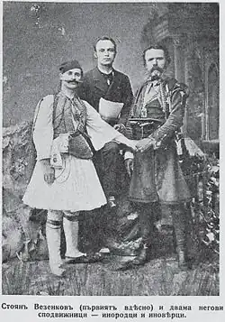 Later he was among the illegally sent by the Serbian government spies in Ottoman Empire, to plan rebellion during the Serbian–Ottoman War (1876–78).[11] Vezenkov was captured by the Turks, near Nis, but escaped. Then Stojan moved to Romania and was among the organizers of the Bulgarian voluntary army units there, which took part in the Russo-Turkish War of 1877–1878. Vezenkov participated in the Russian engineering corps during the war. His both brothers, Petar and Constantine were killed as volunteers in Bulgaria. Vezenkov was the only Bulgarian, present at the signing of the Treaty of San Stefano.[12] For his heroism he was awarded the Russian Saint George's cross for bravery. With the treaty Macedonia was formally ceded to Bulgaria, and the Russian diplomat Michail Hitrovo was sent there, to prepare the creation of a Christian militias. Hitrovo choose Vezenkov to help him in this undertaking.[13] During the Kresna-Razlog Uprising in 1879, that broke out following the Congress of Berlin, which, instead of ceding Macedonia to Bulgaria, returned it to Ottoman control, an armed detachment, led by Vezenkov was organized in Ohrid.[14] After the failure of the Uprising, Vezenkov went back to Russia. He died in Odessa in 1897.[15]