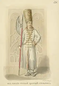 Stolniks were known as palace servants of the Russian rulers since the 13th century.[2] They were also called chashniks, literally "cup-bearers". In the 16th and 17th centuries they were young nobles who brought dishes to the tsar's table, looked after his bedroom, and accompanied him in travels. Those who served tsar in his apartments called room or close stolniks (ближние, комнатные стольники).[3]