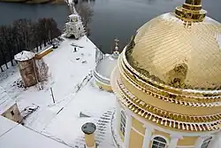 The island is the home of Nilov Monastery, which was founded by Saint Nilus in 1594, and previously welcomed up to 40,000 pilgrims each year. Most of the buildings of the monastery were built in the 18th and 19th centuries in a neoclassical style. Today the monastery complex remains one of the most impressive ensembles of Neoclassical architecture in Eastern Europe. Some of its churches date back to the 17th century. A graceful embankment was completed by 1812, and a large cathedral built in 1821-25. The construction of the causeway to the island was completed in 1812. The Nilov Monastery was one of the largest and wealthiest monasteries in the Russian Empire. Since the 1980s, many Russian Orthodox Christians commemorate the Feast of the Epiphany on January 19th by submerging themselves in the freezing waters, including those surrounding the monastery and the island.[1][2]