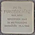 FRANTIŠEK MÜNZ BORN 1885 DEPORTED 1942 TO MAUTHAUSEN MURDERED 11 June 1942 |