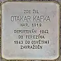 OTAKAR KAFKA BORN 1919 DEPORTED 1942 TO THERESIENSTADT 1943 TO AUSCHWITZ MURDERED |