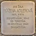 Růžena Adlerová née Fröhlichová was born on 16 June 1874. Her parents were Leopold Fröhlich and Barbora née Herrmann. She was married to Jakub Adler. The couple had at least three sons and two daughters, Josef (also Jozef, born 1904), Anna (born 1906, later named Pisinger), Ota (born 1908), Jindřiška (born 1910) and Jaroslav. Her husband was a merchant, she was a housewife. She and her children Ota and Jindřiška were deported on 26 November 1942 from Klatovy to Theresienstadt concentration camp by transport Cd. Her transport number was 169 of 651. In Theresienstadt, the family was separated. First, in January 1943, her daughter Jindřiška was deported to Auschwitz concentration camp. She was murdered there. Then, on 6 September 1943, her son Ota was deported to Auschwitz. He was murdered there too. At last, on 15 December 1943, also Růžena Adlerová was deported to Auschwitz by transport Dr. Her transport number was 44 of 2,519. She was murdered there.[7][8]