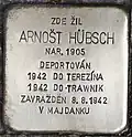 ARNOŠT HÜBSCH BORN 1905 DEPORTED 1942 TO THERESIENSTADT 1942 TO TRAWNIKI MURDERED 8.8.1942 IN MAJDANEK |