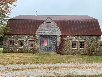 Stone Barn Farm occupies 167 acres (68 ha) of land in north-central Bar Harbor, a rural inland area of the fashionable resort community. It is set on the north side of Crooked Road, just west of its junction with Norway Drive, and consists of 30 acres (12 ha) each of fields and marshland, and about 100 acres (40 ha) of woodland. The farm complex is set near Crooked Road, and consists of a wood-frame house and carriage barn, and an unusual gambrel-roofed barn whose first level is stone and granite (the latter quarried from nearby Otter Creek).[2] As of 2020, only its southern gambrel end is clapboarded. The house is 1+1⁄2 stories in height, with a three-bay gabled front sheltered by a hip-roofed porch. Two additions extend to the rear of the building. The carriage house a single-story clapboarded structure with a gable roof, and a track-mounted sliding door providing access to its interior. The stone barn is fashioned out of glacial till, and has a two-leaf board-and-batten door providing access to its interior.[3]
