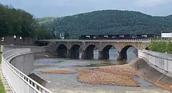 The Stone Bridge spans the Conemaugh River in Johnstown, Pennsylvania. The bridge is a seven-arch stone railroad bridge located on the Norfolk Southern Railway's Pittsburgh Line, built by the Pennsylvania Railroad in 1887–88. Its upstream face was reinforced with concrete in 1929.[1]