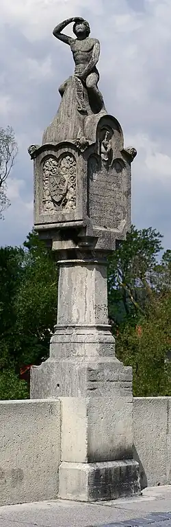 The north end of the bridge was formerly the border between the Duchy (later Electorate) of Bavaria and the Free Imperial City of Regensburg. At the highest point of the bridge is a stone carving called the Bruckmandl or Brückenmännchen (bridge mannikin), a largely naked young man shielding his eyes with one hand and with an inscription reading "Schuck wie heiß" (likely a reference to the hot summer when the bridge was begun[23]). He has been said to symbolise the city's freedoms and its emancipation from the control of the Bishop. He has also been said to represent the bridge builder, and another figure on the cathedral to represent the cathedral builder.[24] He was originally seated on the roof of a mill, and now sits on the bridge itself on the roof of a miniature toll-house.[23] The current version is the third. The original was replaced in 1579; the current statue was erected on 23 April 1854.[25] The 1579 statue, which lost its legs and arms in the fighting in 1809, is in the Regensburg Museum of History.[25] There was formerly a crucifix on the bridge; it was removed in 1694.[23]